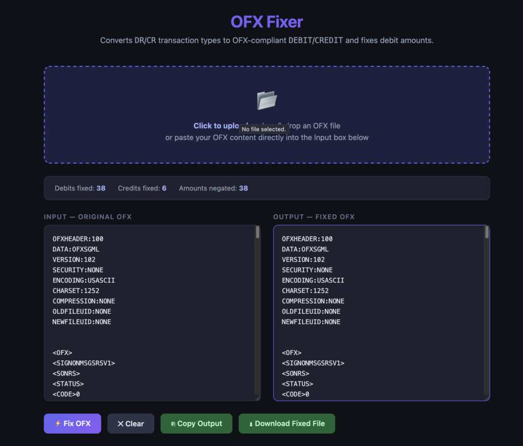 To solve this, I built a small browser-based tool called bw-ofx-fixer. You open it in your browser, drop in your OFX file, and it spits out a corrected version instantly. It handles both issues — fixing the transaction type labels and flipping debit amounts to negative. You can copy the result to your clipboard or download it as a file, and then import it wherever you need it.